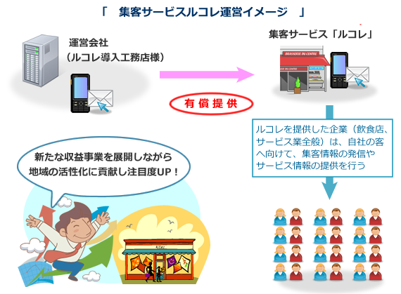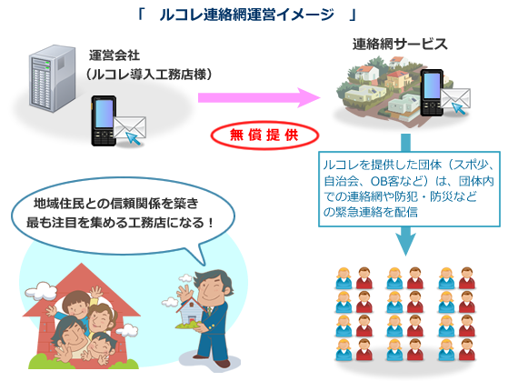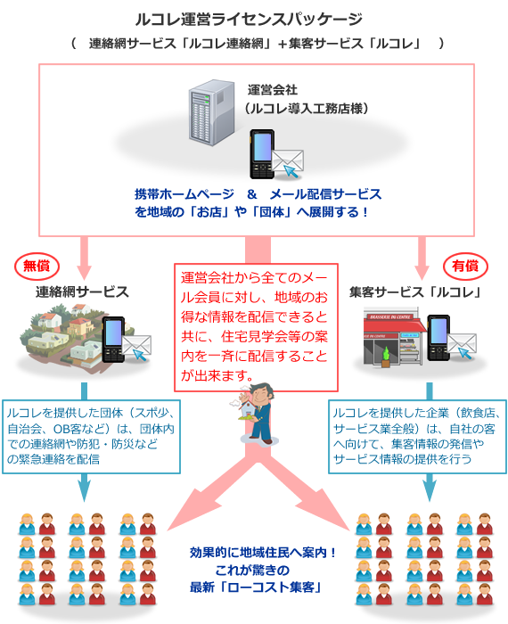 携帯電話のホームページ&メールによる情報提供サービス「ルコレ運営ライセンスパッケージ」 を購入し、お店や団体(自治会、スポ少の保護者、OB客等)に提供することで、地域密着の活動を実現できます。